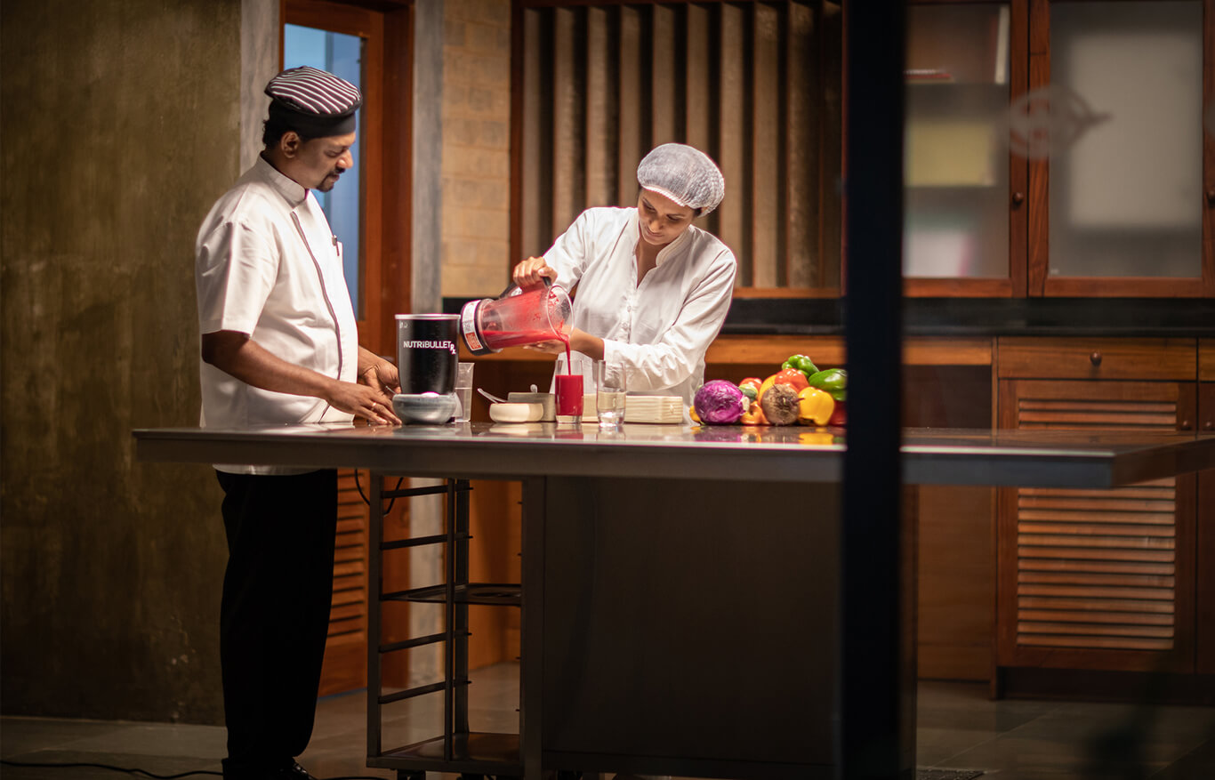 The Raw Food Gourmet experience at Prakriti Shakti's fireless kitchen elevates raw food preparation to a gourmet level. The culinary team maintains a fireless kitchen, preserving the natural properties of ingredients.Prakriti Shakti's kitchen redefines raw eating, combining organic, fresh food with haute cuisine aesthetics. Traditional Kerala Sadya to brownies are created with uncooked, unprocessed ingredients. Every dish is a culinary art crafted to entice with colors, aroma, texture, and taste.