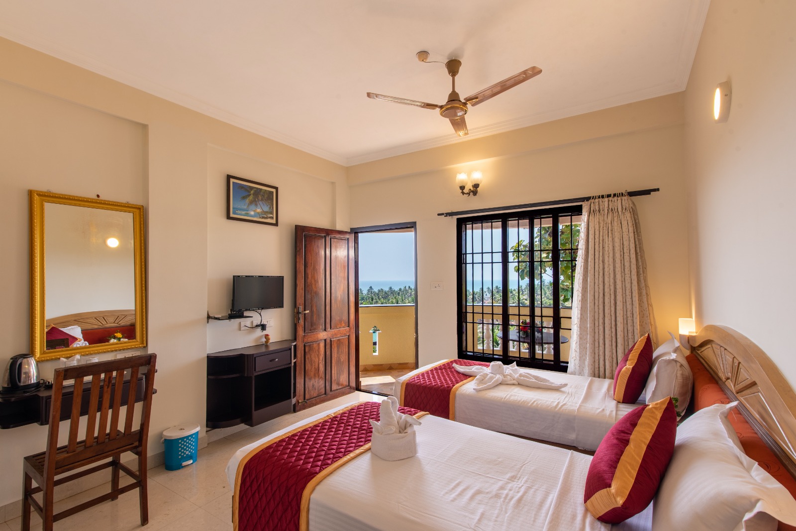 Palm View Rooms are finely crafted rooms that exquisitely capture the centuries-old heritage of Kerala. The resort boasts 40 rooms across three distinct categories: 12 Palm View Rooms offer a breathtaking view of the beach.