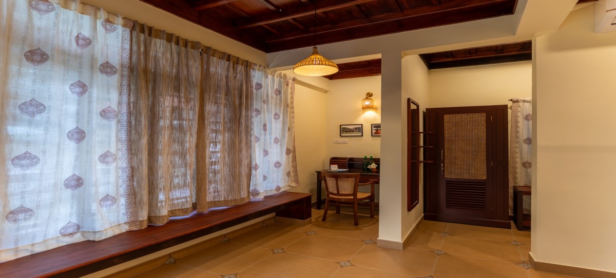 FacilitiesAn exclusive 950 sq.ft. traditional Kerala wooden house, perched gracefully on a hill slope, offers breathtaking views of the swimming pool and the ocean beyond. Thoughtfully designed in authentic Kerala style, the house features a well-furnished living room, a comfortable bedroom, a private sitout, and two spacious bathrooms. With its timeless charm and serene ambience, it provides an ideal retreat that blends heritage, comfort, and scenic beauty.