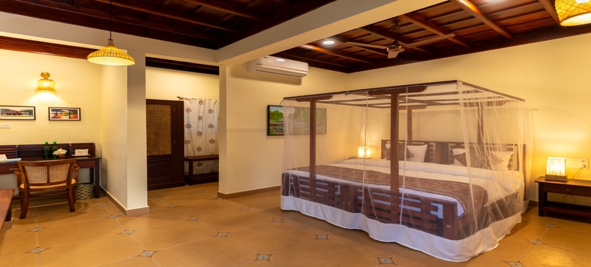Blending comfort with simplicity, the cottages offer air conditioning, a safe locker for added convenience. Mosquito nets are available on request, ensuring restful sleep in harmony with the natural surroundings.