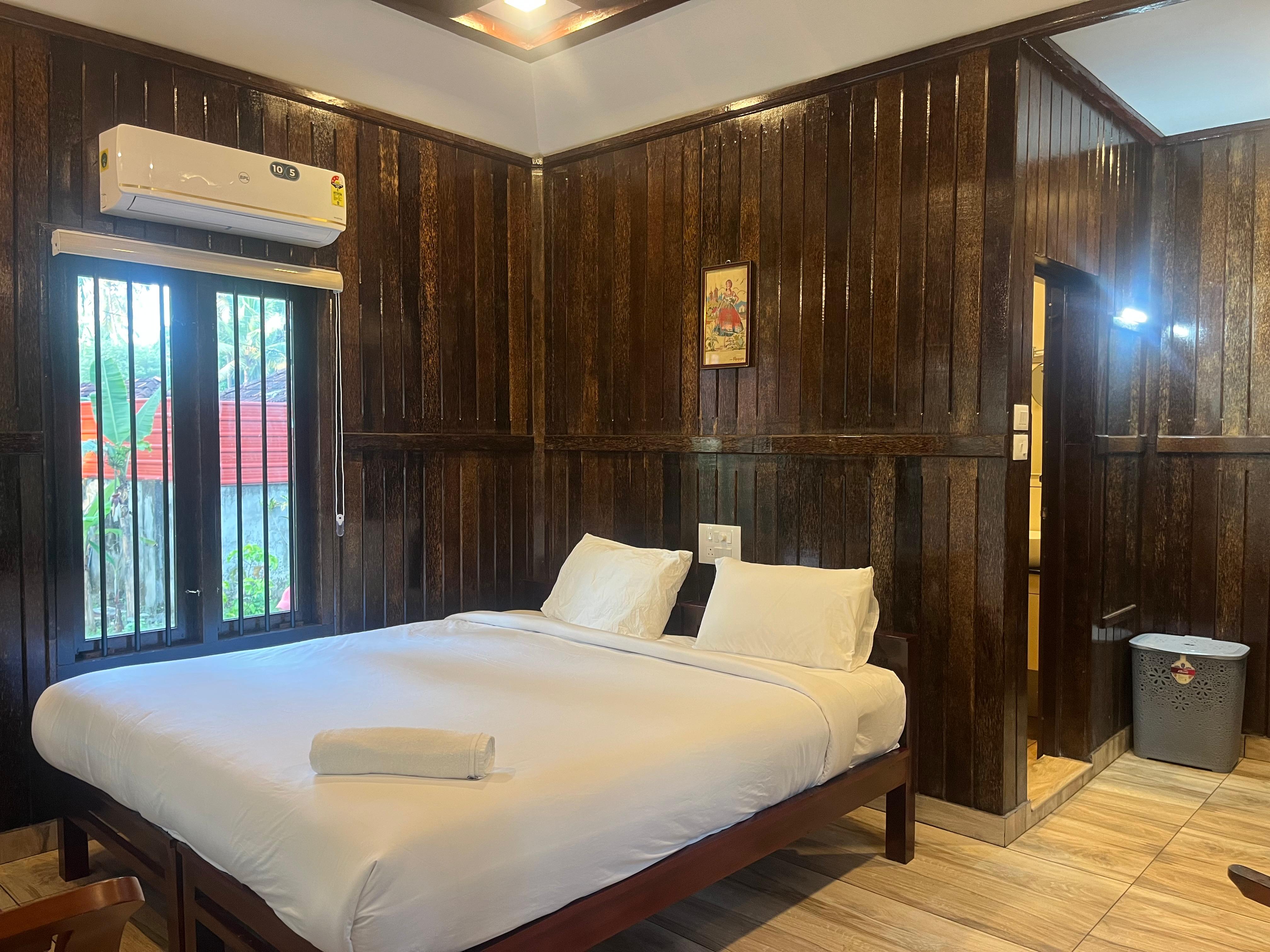 FacilitiesAC Deluxe Room with Balcony at Sree Chithra Ayur Yoga Theeram combines elegance with comfort, offering guests a truly delightful stay. The room is fully air-conditioned and features polished wooden flooring, creating a plush and welcoming charm. A private balcony opens to serene views, providing the ideal spot for relaxation and quiet moments.