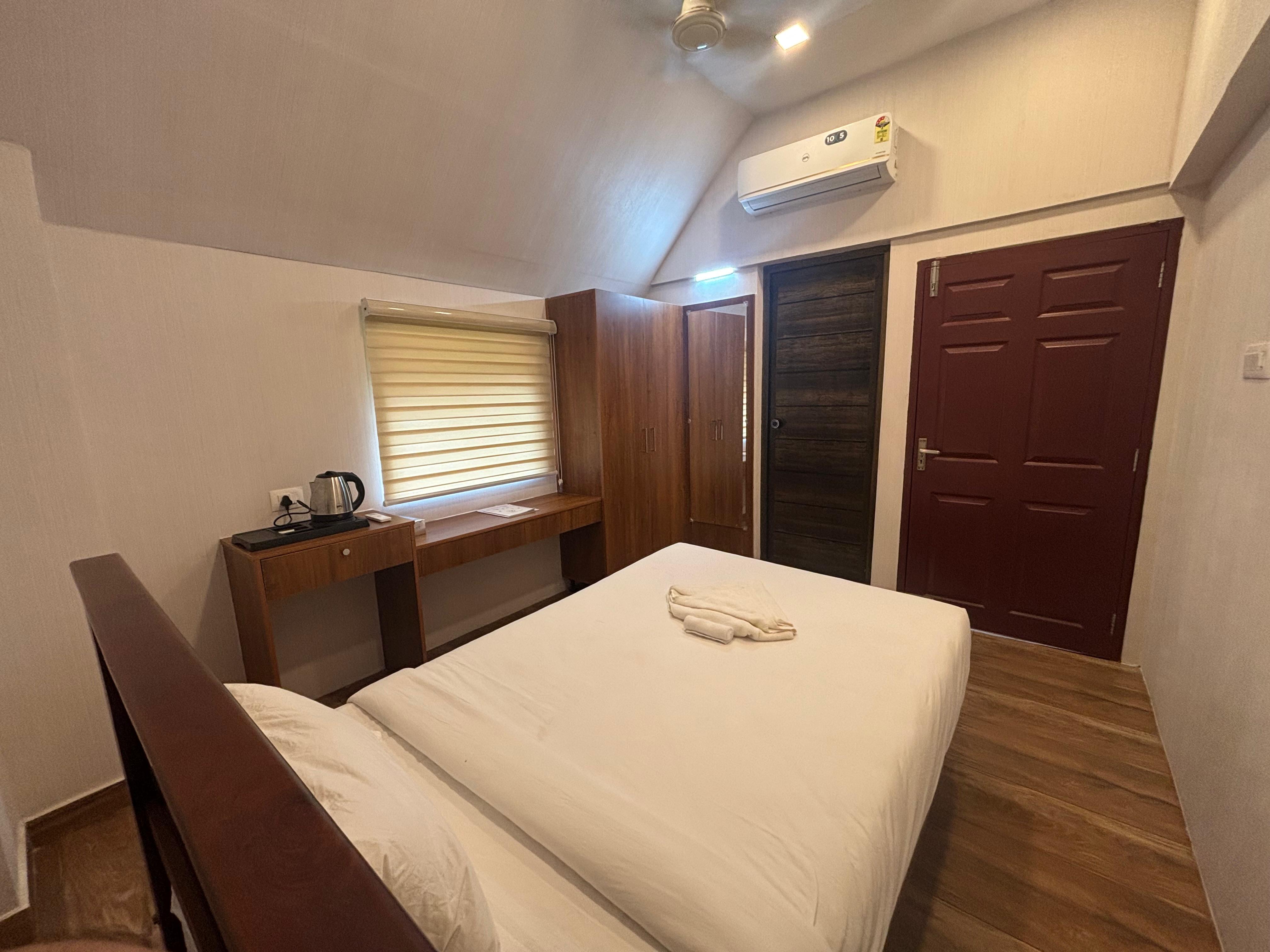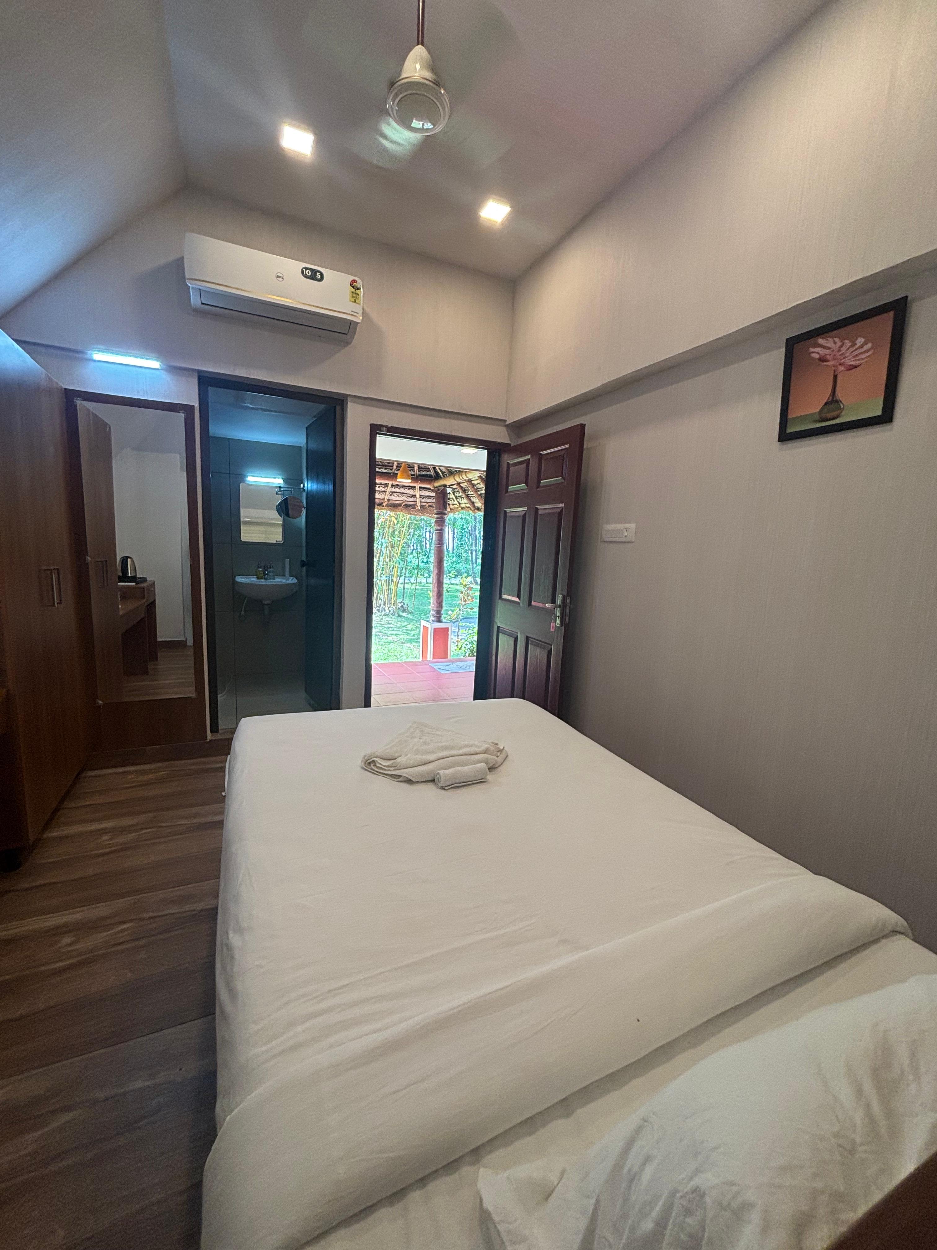 AC Standard Room at Sree Chithra Ayur Yoga Theeram offers a refined blend of comfort and natural charm. Equipped with air conditioning and the room is designed to provide a plush and relaxing stay. A private balcony opens to refreshing views, allowing guests to unwind in a serene setting.